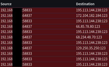 Huh thank you. Now its not like I already have my own NTP instance that I seemingly don’t have the option on the printers for… not sure why I didn’t to look at the destination port frankly 🤷♂️
