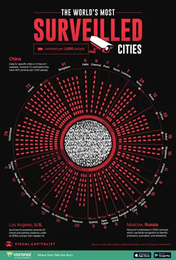 This nice visualization seems to be based on numbers from Comparitech’s ‘The World’s Most Surveilled Cities’ (which is worth a read). Which states China’s numbers can only be based on estimates (as the CCP doesn’t publicly disclose any real numbers): the speculative nature of which, possibly being the reason why it’s not included here. The others are based on sources (one has to request access to, for some reason: which I’m not willing to do), but doubt represent reality: as it correctly recognizes many “private” cameras are public facing (especially in the Western world), which also makes it near impossible to discern which are actually public facing (which might not be all that relevant).