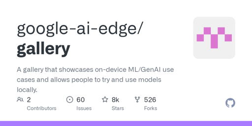 Pro@programming.dev to Technology@lemmy.worldEnglish · 10 months agoGoogle quietly released an app that lets you download and run AI models locallygithub.comexternal-linkmessage-square48fedilinkarrow-up1248arrow-down126