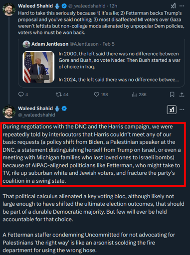 During negotiations with the DNC and the Harris campaign, we were repeatedly told by interlocutors that Harris couldn’t meet any of our basic requests (a policy shift from Biden, a Palestinian speaker at the DNC, a statement distinguishing herself from Trump on Israel, or even a meeting with Michigan families who lost loved ones to Israeli bombs) because of AIPAC-aligned politicians like Fetterman, who might take to TV, rile up suburban white and Jewish voters, and fracture the party’s coalition in a swing state.