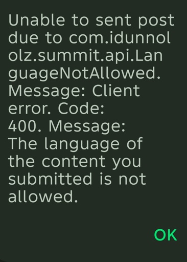 Currently, when selecting the English language as the language of the post and trying to cross-post here it shows that the language is not allowed.