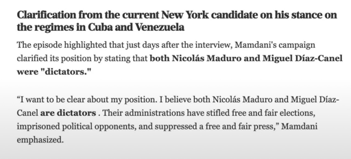 Spectre@lemmy.ml to United States | News & Politics@lemmy.ml · 6 months agoZohran Mamdani calls Cuba and Venezuela dictatorshipslemmy.mlimagemessage-square37fedilinkarrow-up140arrow-down13file-text